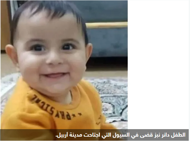 الطفل دانر نبز قضى في السيول التي اجتاحت مدينة أربيل.