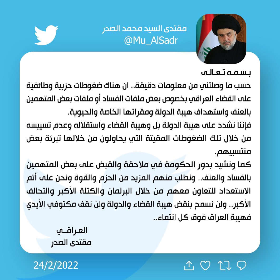 كشف زعيم التيار الصدري مقتدى الصدر، اليوم الخميس، عن ضغوطات حزبية وطائفية على القضاء لتبرئة متهمين بالفساد والعنف.يتبع..
