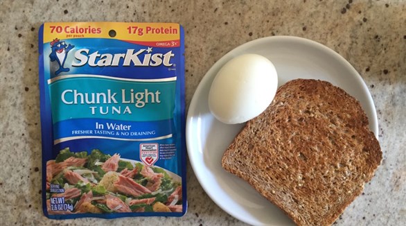 الغداء: 1/2 كوب تونة، شريحة خبز ، كوب قهوة أو شاي يحتوي على الكافيين.
