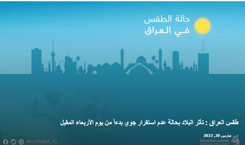 طقس العراق : تأثر البلاد بحالة عدم استقرار جوي بدءاً من يوم الأربعاء المقبل