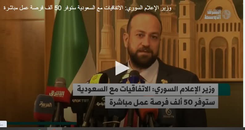 دمشق: «الشرق الأوسط» أعلن وزير الإعلام السوري حمزة المصطفى، أنه سيتم، الخميس، توقيع 44 اتفاقية اقتصادية ومذكرة تفاهم مع السعودية بقيمة 6 مليارات دولار، شاكراً المملكة لدورها في دعم سوريا. ... أكمل القراءة ...